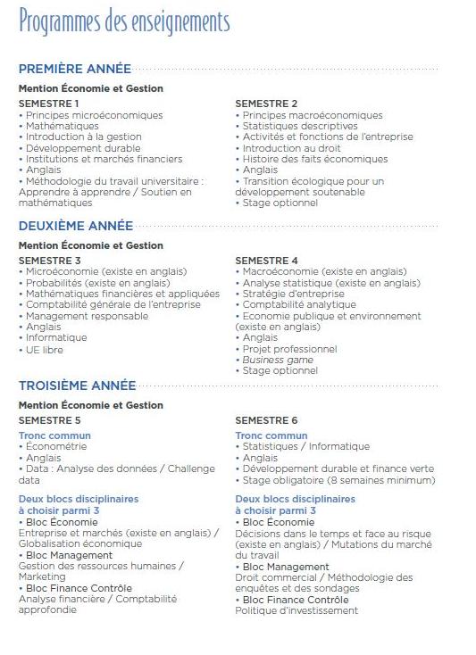 En L1, les étudiants suivent des cours d’économie (microéconomie et macroéconomie), de mathématiques et statistiques, de finance, de gestion, de droit et d’anglais.• En L2, les étudiants suivent des cours d'économie, de probabilités, d’analyse statistique, de mathématiques financières, de comptabilité, de stratégie d’entreprise, d'informatique et d'anglais.